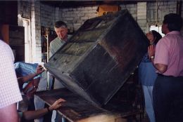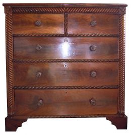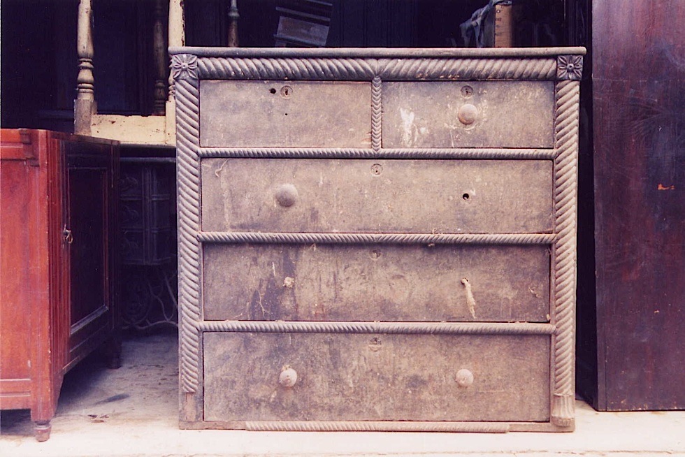 Left is an example of an extremely rare early chest of drawers c.1820, restored by Peter Gibbs. This chest has 17th Century influences rather than the usual 18th Century ones and has Casuarina knobs and escutcheons. The accompanying images show it first in its ‘as found’ state, then being appraised by the Furniture History Society, and finally in its restored state as a piece of national significance.